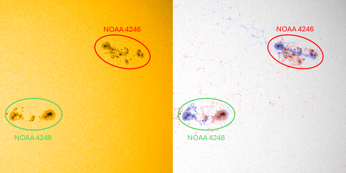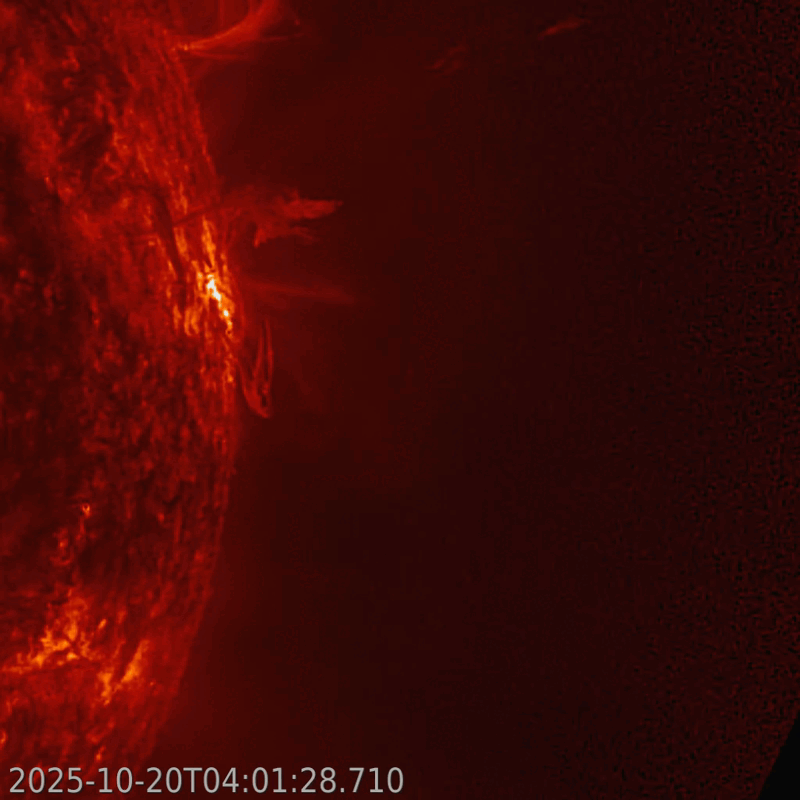The sunspot region in the lower left corner of the white light images and magnetograms is NOAA 4248 (SIDC AR 621). Though large, it had magnetically a much simpler configuration than NOAA 4246. The region produced only 2 M-class flares, an M2 on 14 October and an M1 early on 20 October when the region was near the west limb. The EUV imagery underneath is from GOES/SUVI 304 and shows the spectacular eruption at relatively cool temperatures of 80.000 degrees.