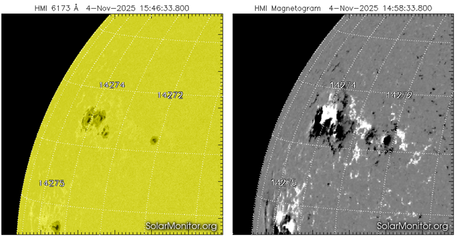 Original 4 November 2025 at 20:45UTC - Active region NOAA 4274 (SIDC Sunspot Group 687) is the return of the flare-productive NOAA 4246. That region was the source of 27 M-class flares which it produced during its transit over the solar disk from 10 to 19 October (see this STCE newsitem). While it was on the Sun's far side, it continued to produce strong eruptions, based on the numerous coronal mass ejections (CMEs) that were observed. Those were obviously directed away from the Earth. But now that active region has returned again and it is still very active: It has gotten a new number, but has clearly retained its old habits as it has just produced an X-class flare.