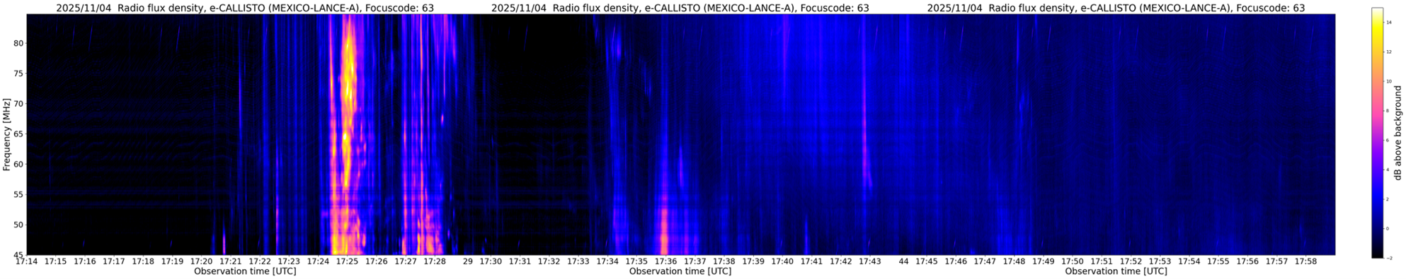No proton event has been observed yet, with the greater than 10 MeV proton flux remaining close to background levels (GOES). Mild enhancements of the radio flux at various frequencies have been observed (NOAA/USAF). Also the 10.7cm solar radio flux at 18UTC was affected, being nearly 40% above its value from the preceding days (Penticton, Canada; 183 sfu compared to 133 sfu). The radiospectrogram underneath was obtained by an eCallisto station in Mexico and shows strong Type III radio bursts between 17:24 and 17:28UTC. The Type II and Type IV bursts are not so obvious, if any (see the STCE SWx Classification page). Note that the bandwidth of this station is quite narrow, spanning only about 40 MHz. The horizontal axis represents time (from 17:14 to 17:59 UTC), the vertical axis is the frequency, with the highest values on top. The flare started (in soft x-rays) at 17:15 UTC, peaked at 17:34 UTC, and ended at 17:51 UTC.