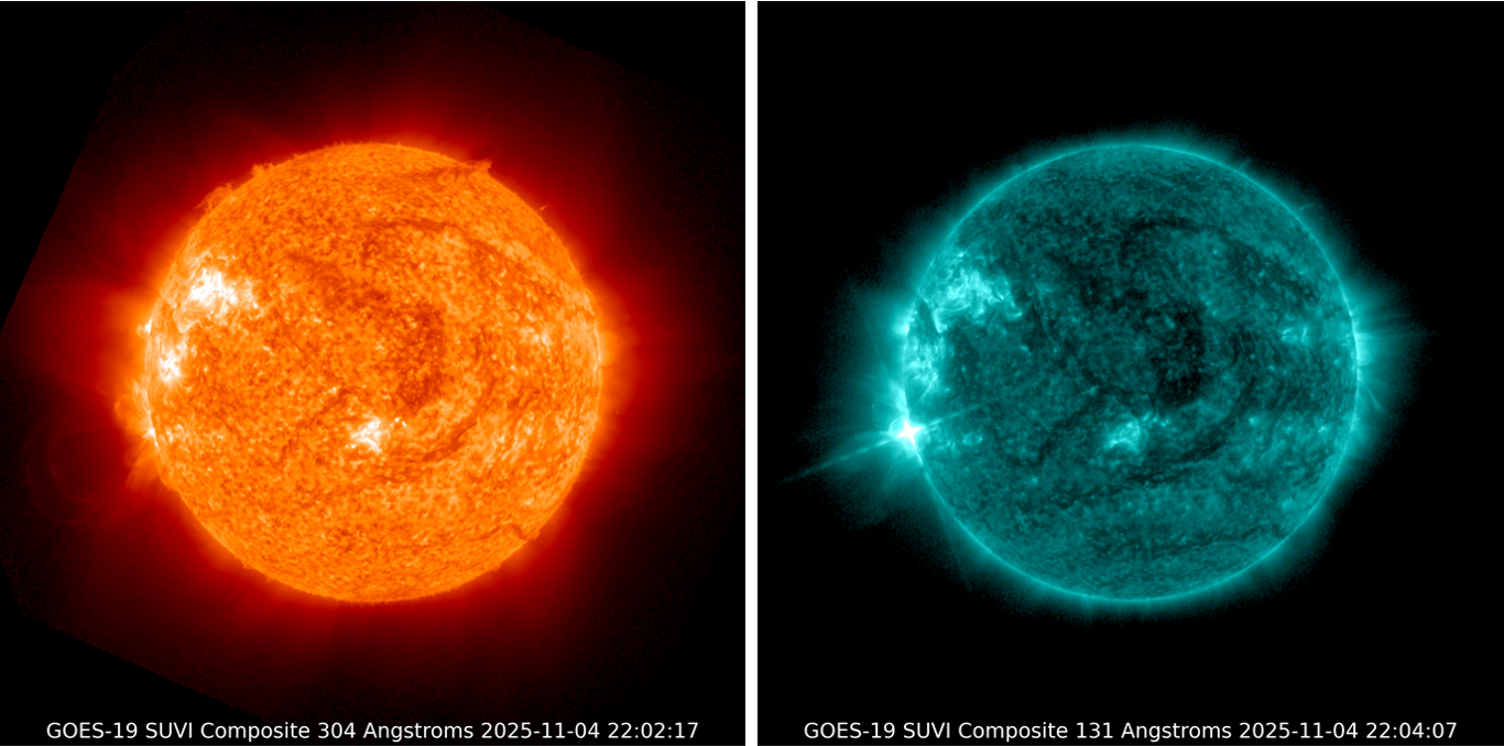 UPDATE 4 November 2025 at 22:45UTC - The Sun produced a second X-class flare, just a few hours after the X1.8 event discussed underneath. The X1.1 flare peaked at 22:01 UTC. However, it did NOT have NOAA 4274 as its source, but rather an active region just behind the southeast solar limb as can be seen in the GOES/SUVI images below showing the flare in extreme ultraviolet (EUV) near its peak time: left at temperatures around 80.000 degrees, and on the right at temperatures of several million degrees. The diffraction patterns in the EUV images are image artifacts, and are not related to the flare itself - See this STCE newsitem for more info. A proton event from this eruption is unlikely due to its location, and any associated coronal mass ejection (CME) is very likely not earth-directed. More information will be given by the SIDC forecaster as the region rotates over the east limb.