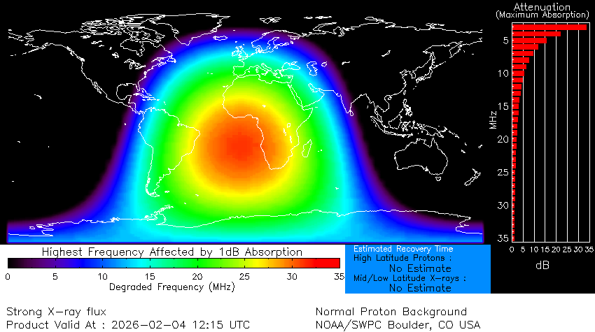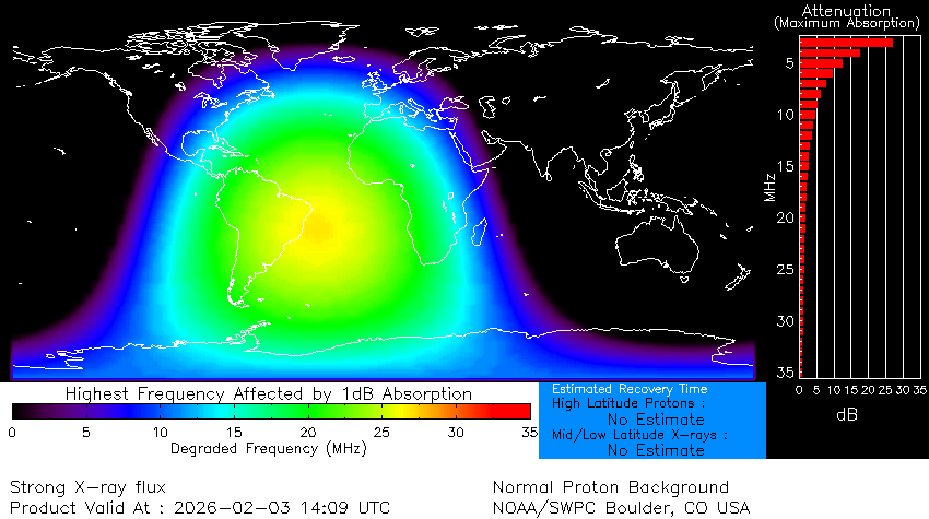 So, it was no surprise that the region produced another X-class flare today. This X1.5 flare peaked at 14:08 UTC (GOES/SUVI image and underneath). The ionizing radiation of this X-class flare affected the lower frequency portion of the High Frequency communication band (HF Com ; 3 - 30 MHz) on the dayside of the Earth, mainly over Africa, the southern portion of the Atlantic Ocean, and most of South-America. An advisory to civil aviation has been issued (PECASUS). The effects of the X1 flare on HF Com can be seen in the D-RAP (NOAA/SWPC) map underneath.