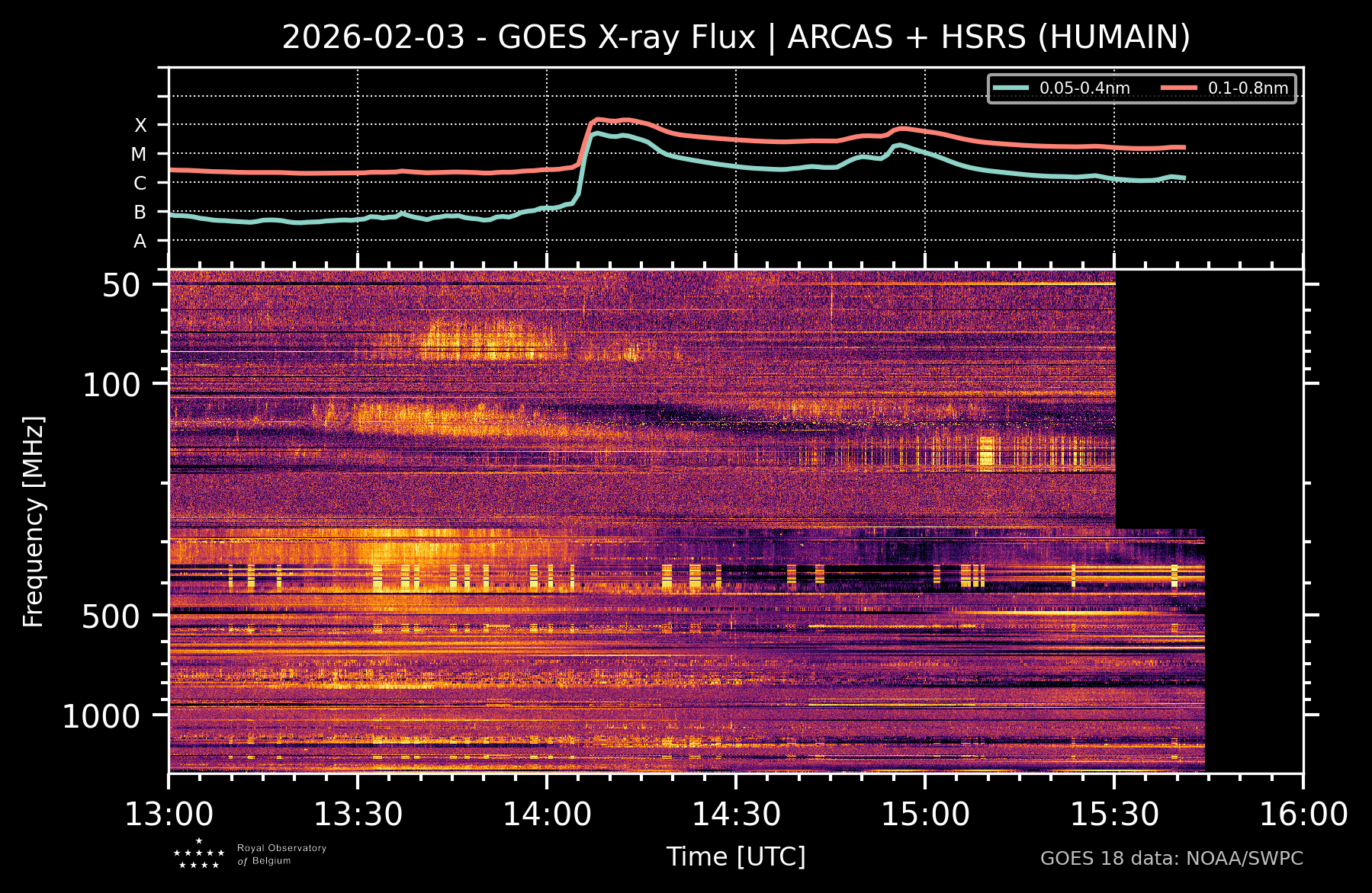 This active region has now produced 5 X-class flares, with the strongest an X8.1 peaking late on 1 February at 23:57 UTC. This is one of the strongest solar flares of the ongoing solar cycle (SC25 tracking page). In the diagram (GOES) underneath, the X1.5 flare is somewhat hidden in the decline of the much stronger X8 flare. The ionizing radiation of the X8 flare itself affected the lower frequency portion of the High Frequency communication band (HF Com ; 3 - 30 MHz) on the dayside of the Earth, mainly over the Pacific Ocean, Australia and Southeast Asia (D-RAP map). Advisories to civil aviation have been issued (PECASUS). Of note is that since the start of the enhanced flaring activity (from about 10:00 UTC on 1 February onwards), the x-ray flux has been consistently high enough (above M1; green thick line) for an almost continuous minor disturbance of the HF Com on the dayside of the Earth.