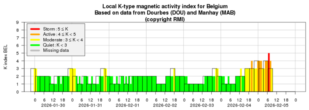 UPDATE 5 February 2026 at 09:30UTC - The magnetic cloud associated with the powerful X8 flare from late on 1 February, arrived yesterday. As expected, it only brushed the Earth's magnetosphere. This resulted in a minor geomagnetic storm (Kp = 5). For Belgium, the local magnetic index K_BEL (STCE/RMI) also showed a (brief) episode of minor storming (K_BEL = 5). This is too weak for polar lights to be visible from Belgium. The storm is still ongoing, with a decreasing chance on a small intensification, pending the orientation of the magnetic field as the interplanetary CME passes by. There remains a good chance on further strong eruptions by SIDC Sunspot Group 784 (NOAA Active Region 4366) in the days ahead.