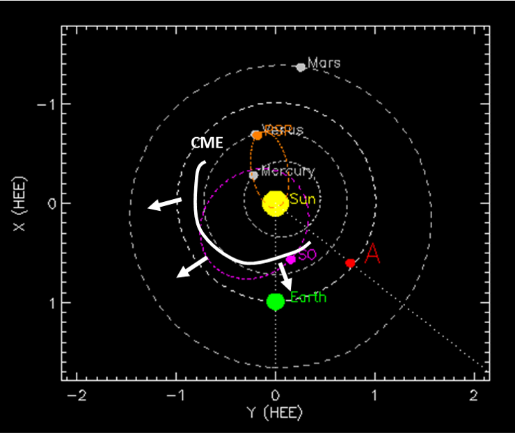 The eruption seems not to have been associated with any solar radiation storm (the flux of energetic protons has remained at background levels). Analysis of the coronagraphic imagery (SOHO) seems to indicate that at least the X8 flare may have been associated with a coronal mass ejection (CME, i.e. the ejection of a magnetic cloud filled with charged particles from the Sun into space). This seems to be confirmed by imagery from other satellites such as STEREO-A (see images underneath with locations of the satellites to the right). As the SIDC SWx forecaster writes in the latest SIDC PRESTO (11:50 UTC): "...The CME has an angular width of about 150 degrees, with an Earth directed component. A preliminary speed derived from the available data is around 700 km/s, giving an expected arrival time on the second half of February 4 (this will be updated when more data becomes available...). " If the CME arrives, there's a chance on minor to strong geomagnetic storming (Kp = 5 to 7), with for Belgium a small chance on photographic aurora low near the northern horizon. As NOAA 4366 rotates further over the solar disk, CMEs associated with further strong flaring from this region may be better directed to Earth causing further geomagnetic storms.