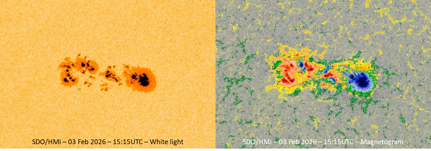 UPDATE 3 February 2026 at 16:30UTC - SIDC Sunspot Group 784 (NOAA Active Region 4366) is now about 14 times as wide as the Earth, and has an area of about 10 times the surface area of the Earth. As can be seen in the SDO/HMI white light image and the magnetogram next to it, it still has a complex magnetic structure, with red and blue colours denoting opposite magnetic polarity. The middle and trailing portion still have strong delta structures, i.e. sunspots very close to each other but of opposite magnetic polarity. These structures may be the source of further strong flaring.