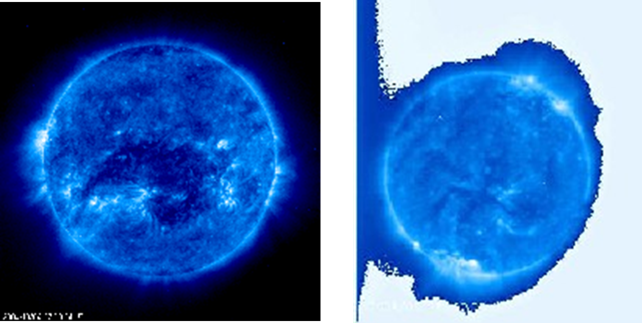 The Coronas-F spacecraft was launched on July 31, 2001, in particular to watch the Sun during the descending phase of the 11-year cycle. Coronas is an international project between Russian and Ukranian space agencies. The instrument SPIRIT onboard has our special interest as it images the full Sun in extreme ultraviolet, similar like EIT. The blue SPIRIT image on the right is taken in 17.5 nm, while the EIT image on the left pictures the Sun in 17.1 nm. Both wavelengths are close to each other.